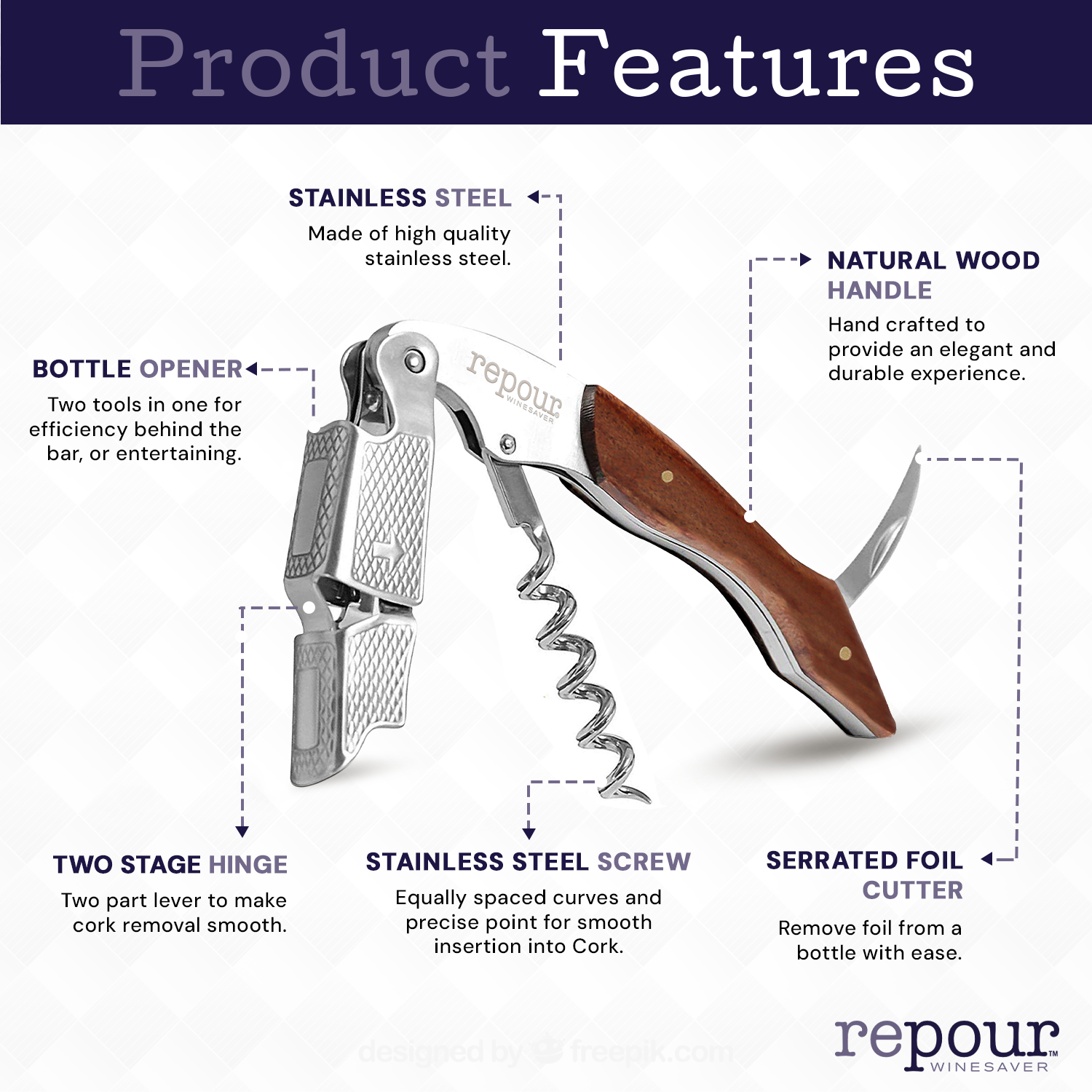 - The Repour Corkscrew, crafted with a stainless steel body and a choice of a Rosewood or Mahogany handle, combines style and durability for easy cork removal. Once your bottle is opened, insert a Repour like a regular stopper; it absorbs oxygen to keep your wine's flavor and aroma as fresh as the day it was opened.