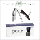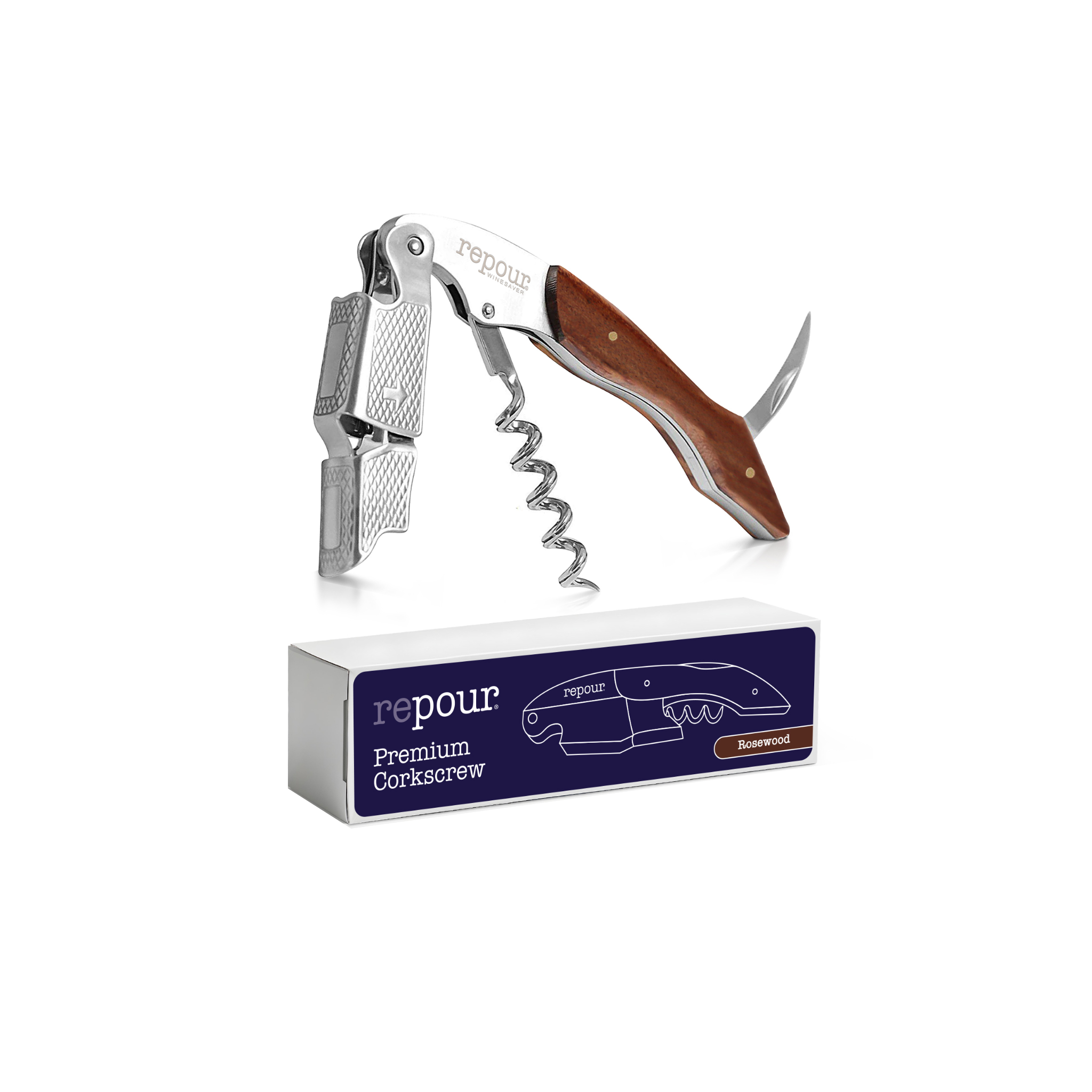 - The Repour Corkscrew, crafted with a stainless steel body and a choice of a Rosewood or Mahogany handle, combines style and durability for easy cork removal. Once your bottle is opened, insert a Repour like a regular stopper; it absorbs oxygen to keep your wine's flavor and aroma as fresh as the day it was opened.